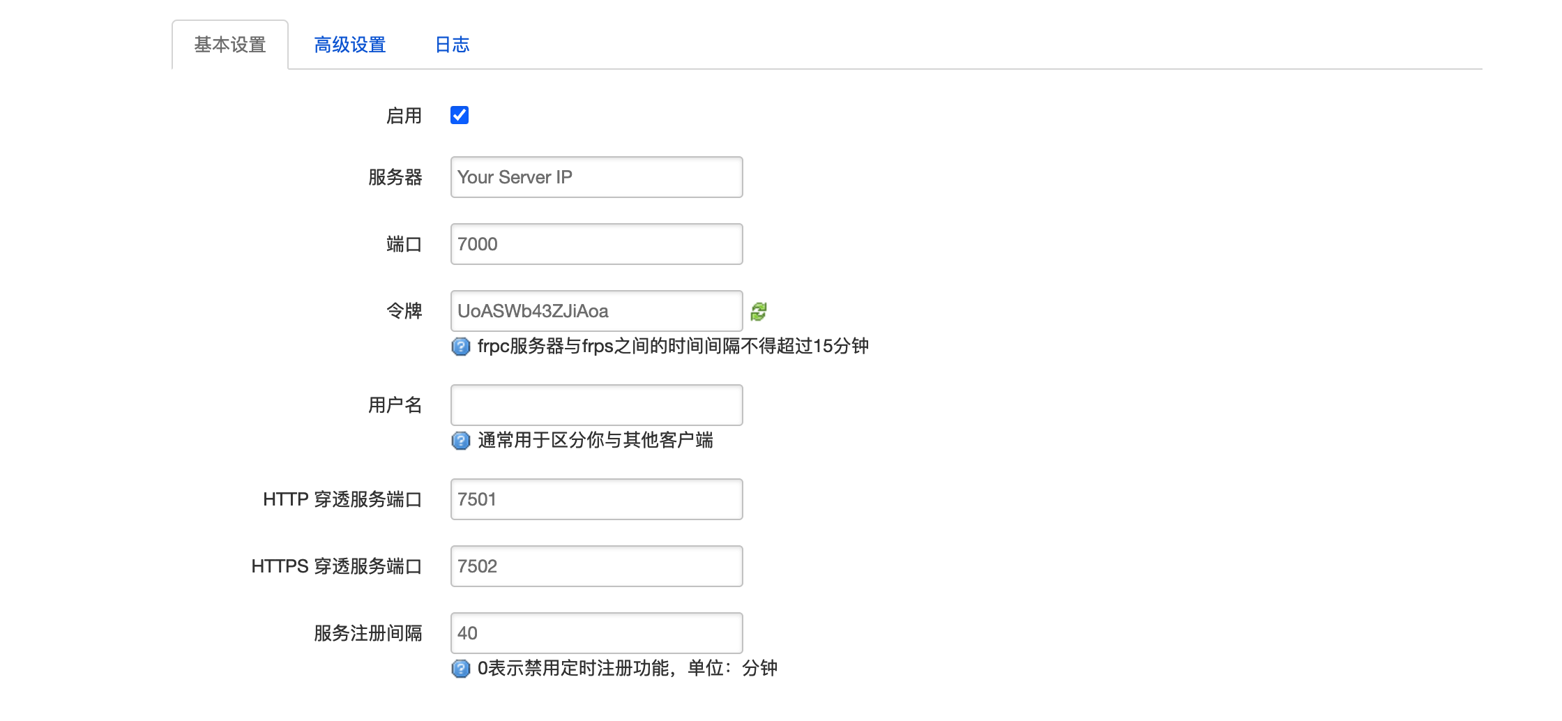 HTTP內網穿透端口和HTTPS的內網穿透端口7501/7502建議填寫服務器端可以使用的端口。 保存以後,服務器端的frps會打印日誌,現在目前是服務器端與客戶端成功的建立了內網傳圖的隧道,想要通過服務器的某個端口訪問Openwrt下的主機,還需要進一步配置。