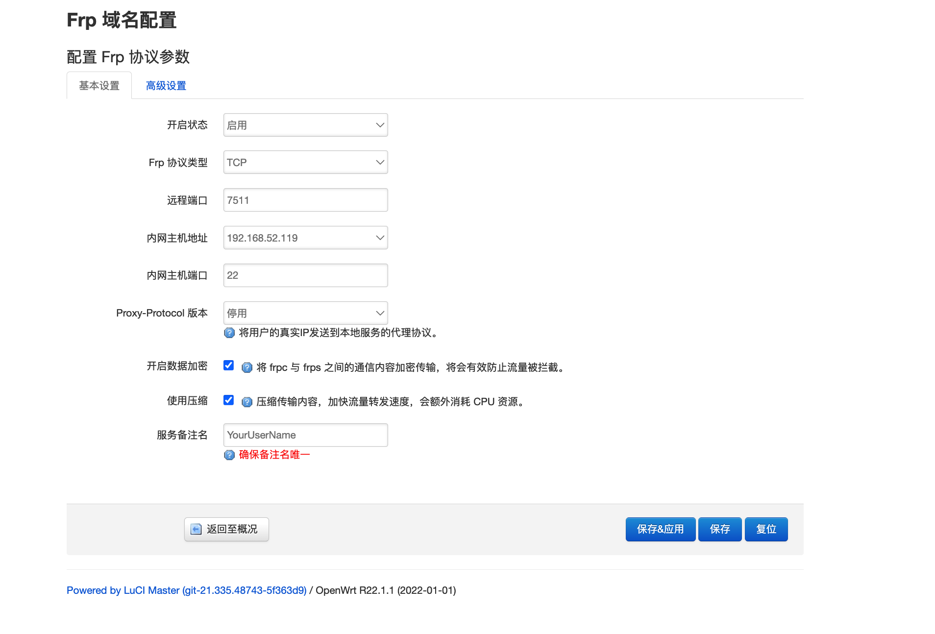 openwrt上的frp有服務端和客戶端,在openwrt的後台,導航到【服務】->【frp內網穿透】,建立與服務器端的通信。做如下配置: