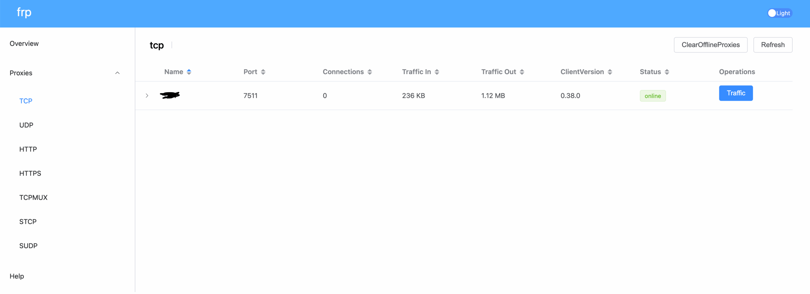 保存與應用配置以後,服務器端的日誌會有提示信息,在frps的後台面板看到該用戶上線。